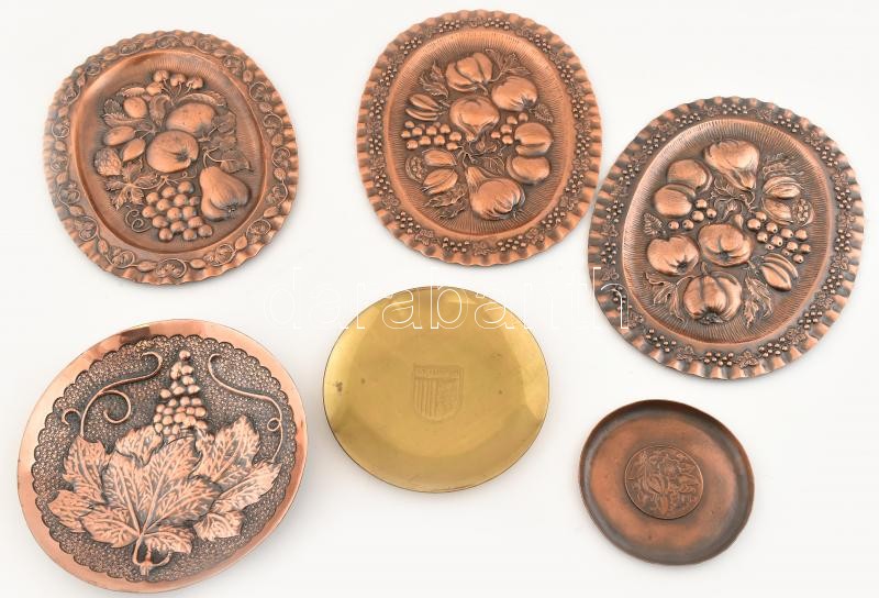 Leírás: 6 db fém dísztál, falra akasztható, d: 12,5-21 cm ill. 29,5x22 cm méretben
