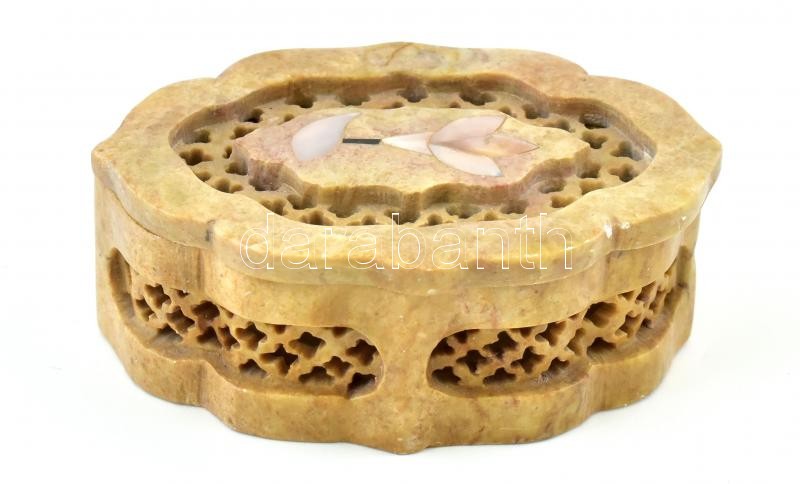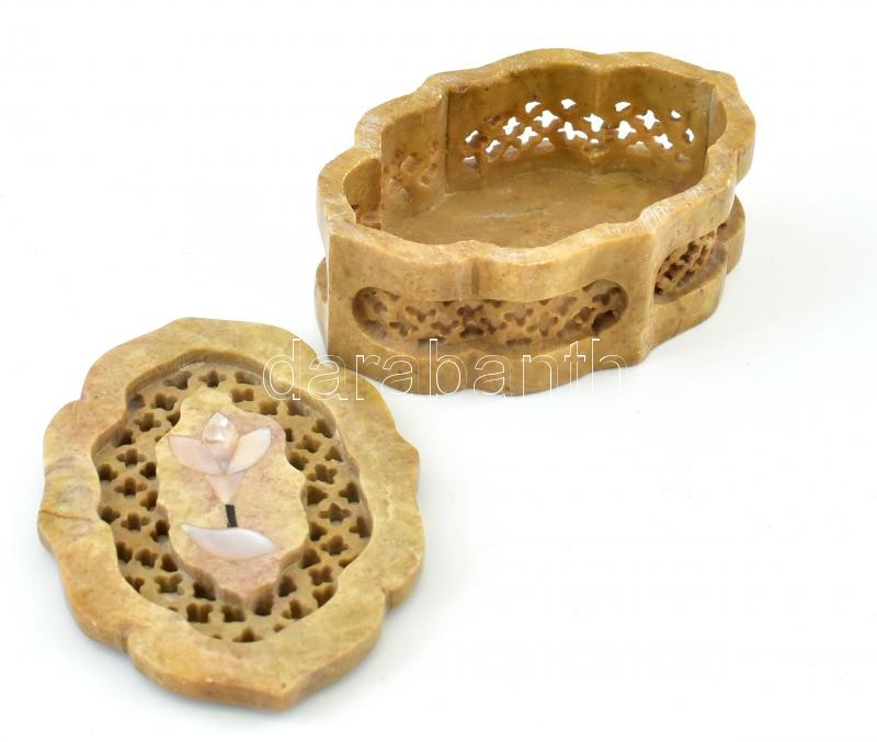 Leírás: Áttört zsírkő doboz, kopásnyomokkal, 8x5cm