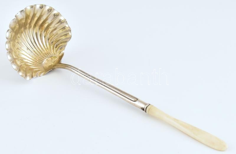 Leírás: Csont markolatú, ezüstözött alpakka merőkanálka, kopott, h:21cm