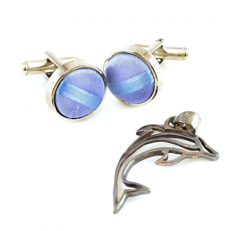 Leírás: Delfin medál, h: 2,5 cm és 1 pár mandzsetta gomb, d: 1,5 cm