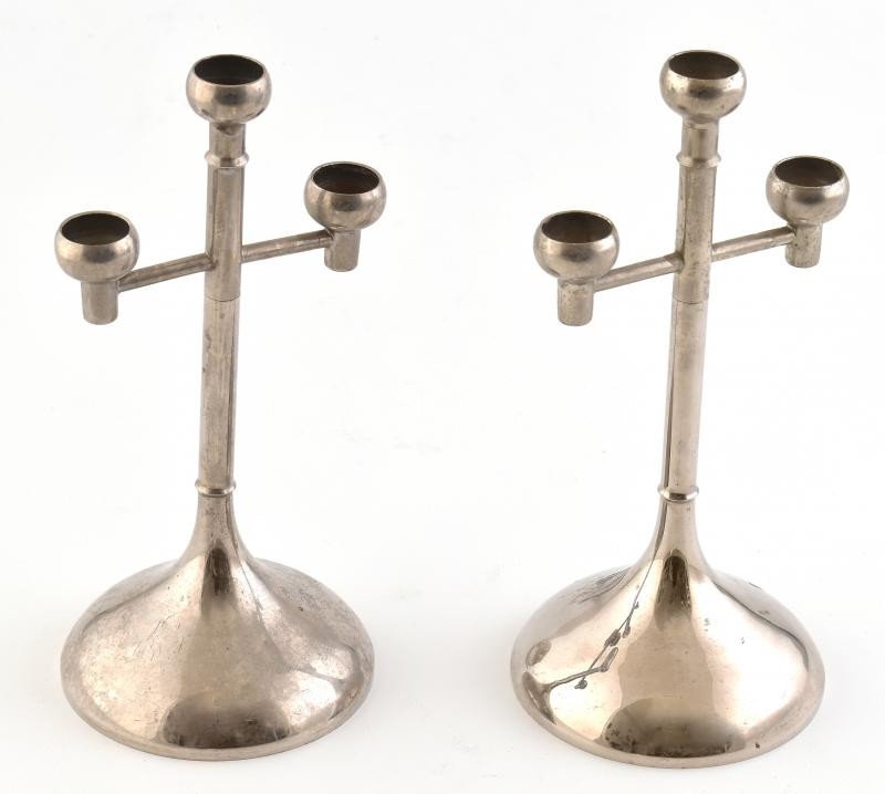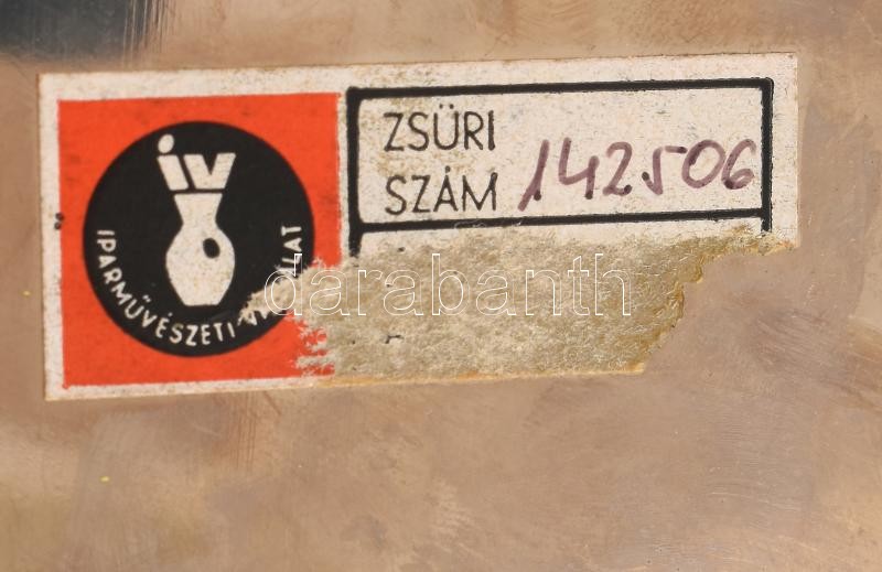 Leírás: Fördős László (1938- ): Iparművész gyertyatartó pár. Fém, jelzett, Iparművészeti Vállalat hiányos zsűri címkéjével, kopásnyomokkal, m: 23,5 cm