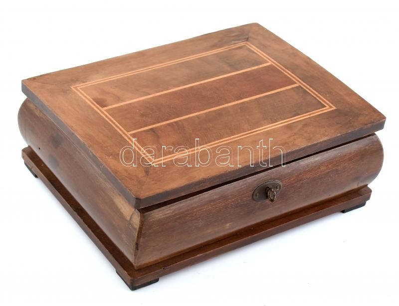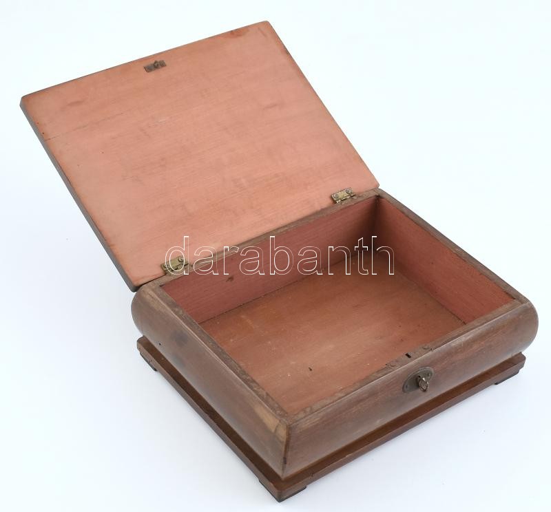 Leírás: Régi fadoboz kuccsal, zár működik, kopott, apró sérülések, 25x19x9,5cm