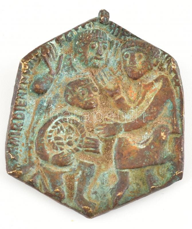 Leírás: Régo bronz keresztény medál, sérült, kopott, akasztó nélkül, 6x5cm