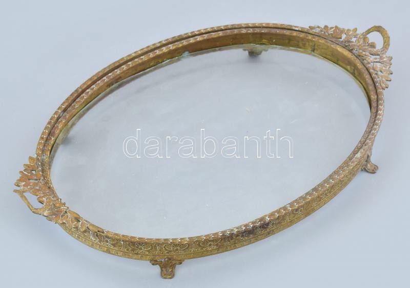 Leírás: Réz keretes kínáló tálca, üveg lappal. 34x22 cm