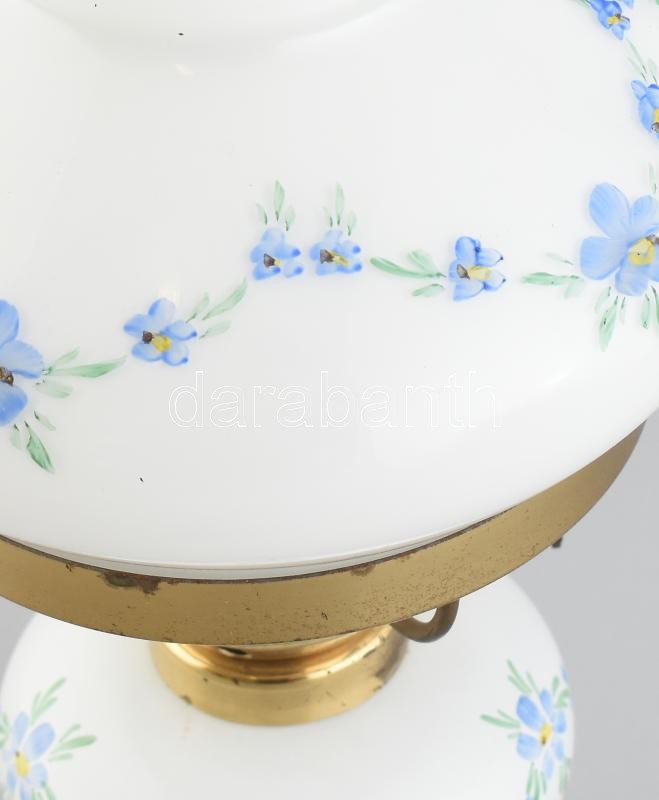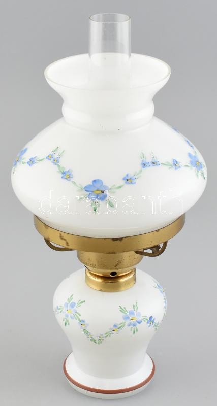 Leírás: Tejüveg testű petróleumlámpa, kézzel festett virágos mintával, üveggel, kisebb kopásnyomokkal, m: 30 cm