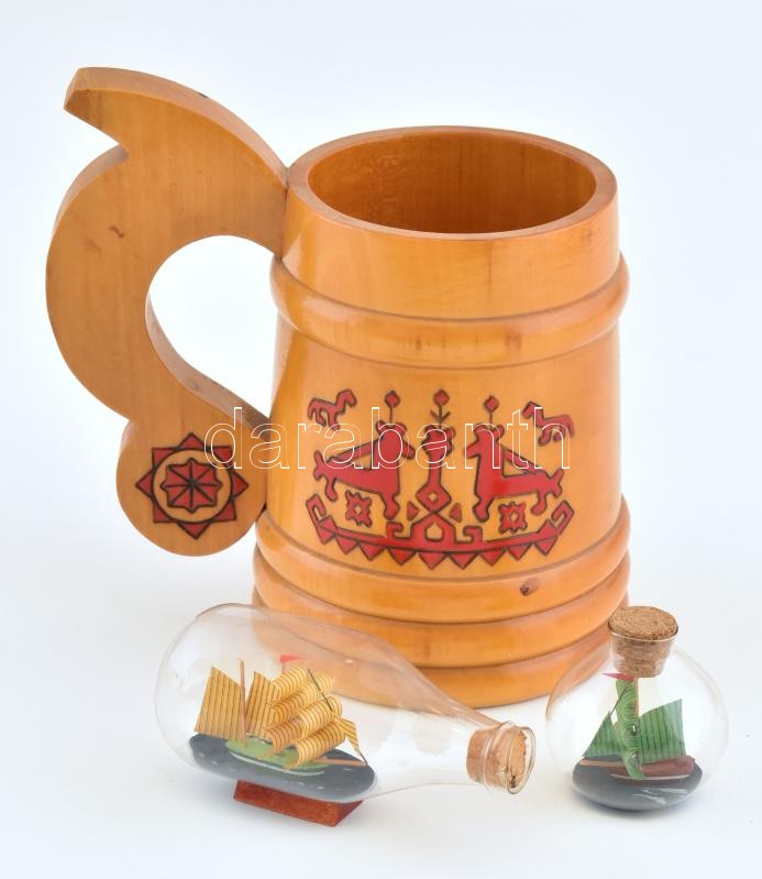 Leírás: Türelem üvegek, 2 db, benne hajókkal, 9,5x5 cm és 5x4,5 cm + Fa korsó, m: 15 cm;