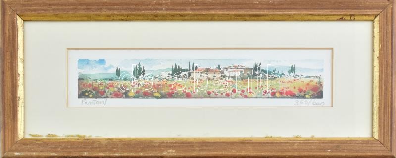 Leírás: Olvashatatlan jelzéssel: Olasz táj, nyomat, számozott (360/600), üvegezett keretben, 5×22 cm, keret belső méret: 10×29 cm, kopásokkal