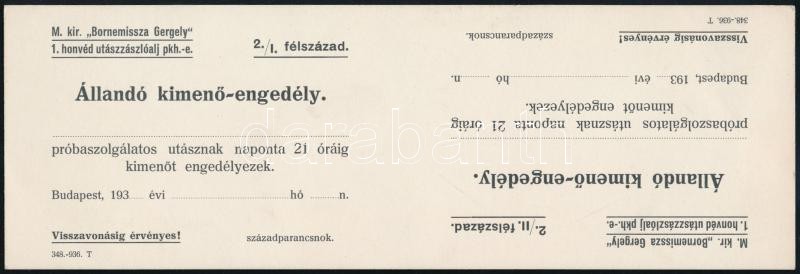 Leírás: cca 1935 M. kir. "Bornemissza Gergely" 1. honvéd utászzászlóalj pkh.-e állandó kimenő engedély kartonja, jó állapotban