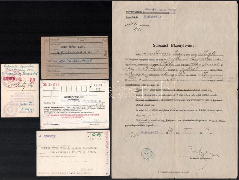 cca 1941-1960 4 db-is militária tétel (sorozási bizonyítvány, bevonulá... https://www.darabanth.com/hu/413-Gyorsarveres/413.0/Mutargy-papirregiseg-egyeb/Militaria~500028/cca-1941-1960-4-db-is-militaria-tetel-sorozasi-bizonyitvany-bevonulasi-papir-behivoparan~II2574886