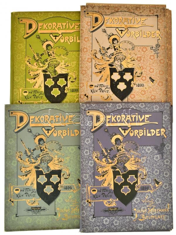 1893-1896 Dekorative Vorbilder. 4 db aranyozott, illusztrált egészvászon mappája. Össz. 12 db dekoratív historizáló és szecessziós nyomattal különféle témákban, a nyomatok évfolyama nem ismert. Lapok széle részben kisebb szakadásokkal vgay kisebb foltokkal. Mappákon kopásnyomokkal, korukhoz képest jó állapotban Lapméret: 36x25 cm