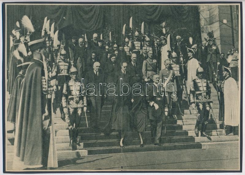 1942 ifj. vitéz Horthy István (1904-1942) hősi halált halt kormányzóhelyettes temetési menete elhagyja a Parlamentet, élén a kormányzói párral, Horthy Miklóssal (1868-1957) és felesége Horthy Miklósné Purgly Magdolna (1881-1959), nyomat kartonra kasírozva, 19x27 cm