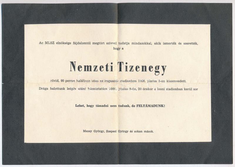 Leírás: 1986 A Nemzeti Tizenegy gyászjelentése (1986. június 2., Szovjetunió-Magyarország 6-0 mérkőzés), hajtott