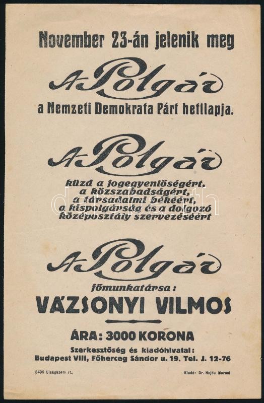 Leírás: cca 1890-1910 "November 23-án jelenik meg A Polgár, a Nemzeti Demokrata Párt hetilapja" (főmunkatárs: Vázsonyi Vilmos), reklámlap, 22x14 cm