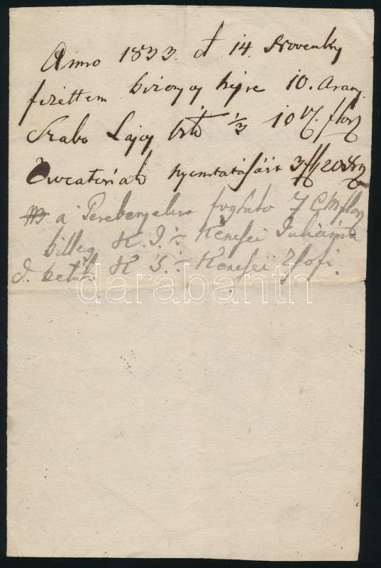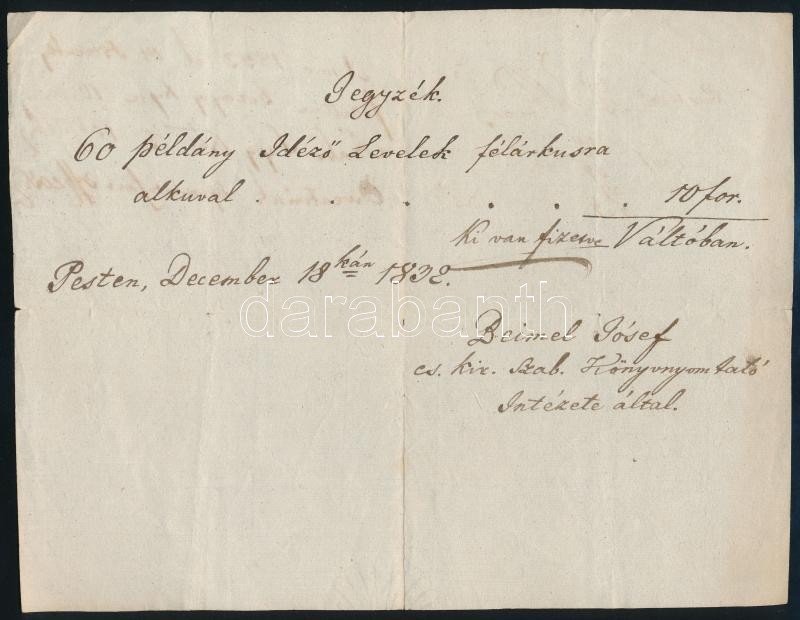 Leírás: 1838 Beimel József (1798-1856) nyomdász autogáf nyugtája idézőlevelek eladásáról
