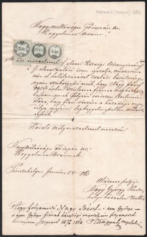 Leírás: 1863 Pincehely, kérelem házassági engedélyhez 25+6+5 kr okmánybélyeggel