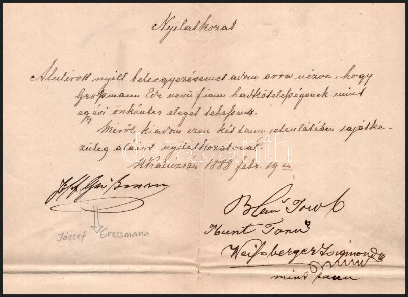 Leírás: 1888 Nagykanizsa, szülői nyilatkozat, hozzájárulás egy fiú egy évi önkéntes hadkötelezettségéhez