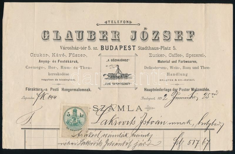 Leírás: 1892 Bp. Városház tér, Glauber József Cukor-, Kávé stb. kereskedésének fejléces számlája 5 kr okmánybélyeggel