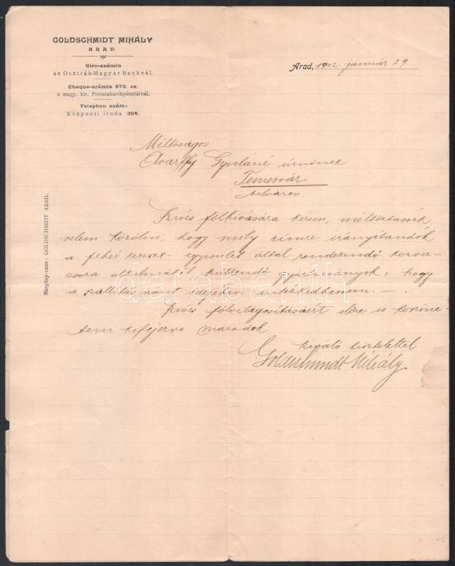 Leírás: 1902 Arad, Goldschmidt Mihály Giro-számla fejléces levélpapírjára írt levél