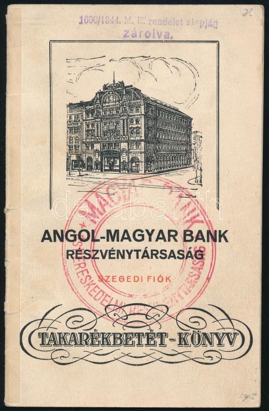 1941 Angol-Magyar Részvénytársaság takarékbetétkönyv, "1600/1944. rend... https://www.darabanth.com/hu/413-Gyorsarveres/413.0/Mutargy-papirregiseg-egyeb/Okmanyok~500018/1941-Angol-Magyar-Reszvenytarsasag-takarekbetetkonyv-16001944-rendelet-alapjan-zarolva~II2577248