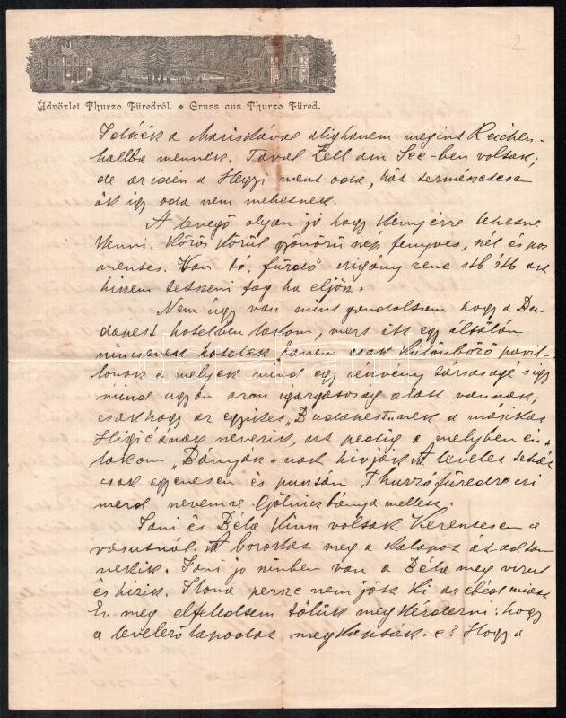 Leírás: cca 1900 "Üdvözlet Thurzófüredről" fejléces levélpapírra írt személyes hangvételű levél