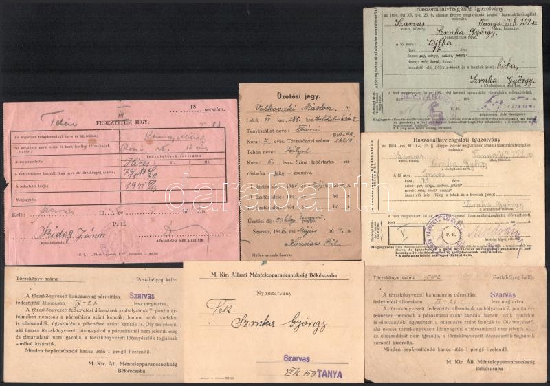cca 1930-1950 Szarvas, kancák fedeztetésével kapcsolatos nyomtatványok, haszonállat-vizsgálati igazolványok, űzetési jegy, fedeztetési jegy, összesen 7 db