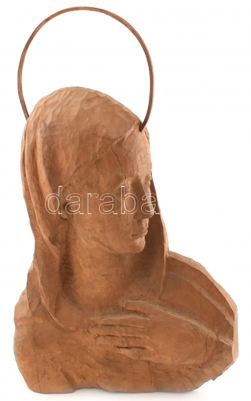 Leírás: ifj. Kurbel József (?): Szűz Mária. Faragott fa, réz, jelzés nélkül. Falra akasztható, repedésekkel, 47x33 cm
