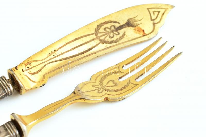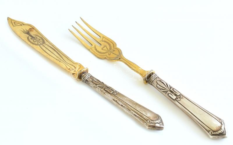 Leírás: Ezüst (Ag) markolatú tálaaló villa és kés, sérült,