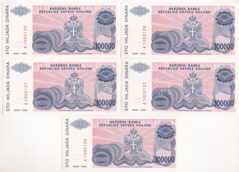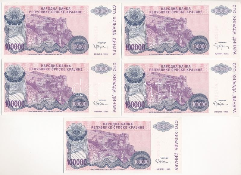 Horvátország / Krajna Szerb Köztársaság 1993. 100.000D (5x) sorszámkövetők "A 1002125 - A 1002129" T:1