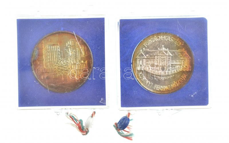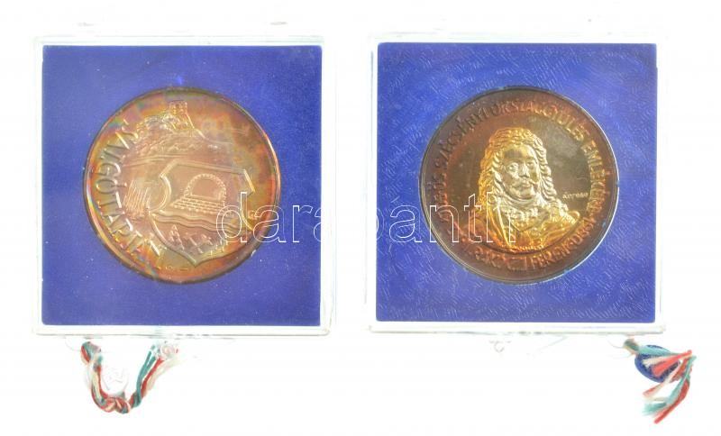 1980. "Az 1705-ös szécsényi országgyűlés emlékére - II. Rákóczi Ferenc / Forgách-kastély - Kubinyi Ferenc Múzeum" jelzett Ag emlékérem plombált ÁPV tokban (~19g/0.640/32mm) + DN "Salgótarján" jelzett Ag emlékérem plombált ÁPV tokban (~24g/0.835/32mm) T:1- patina