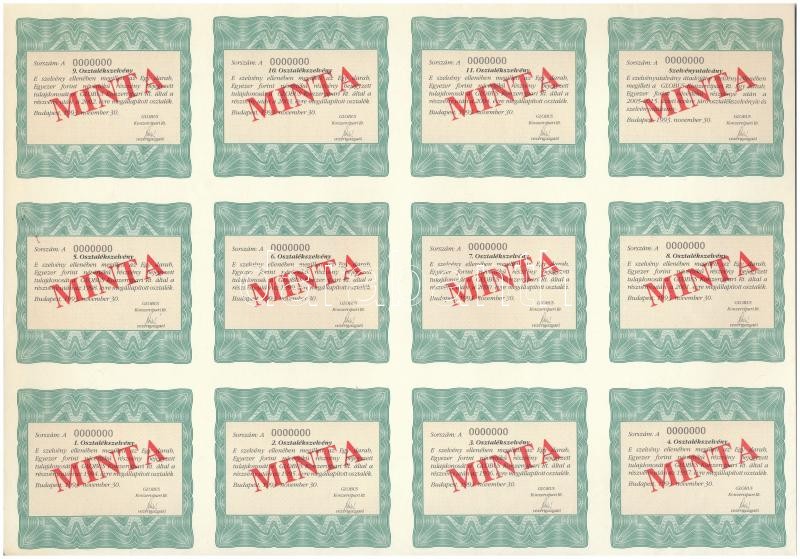 Budapest 1993. "Globus Konzervipari Részvénytársaság" névre szóló részvénye 1000 forintról, kitöltetlen, magyar és angol nyelven, "MINTA" felülnyomással, 000-ás sorszámmal, szelvényekkel T:I