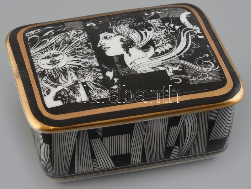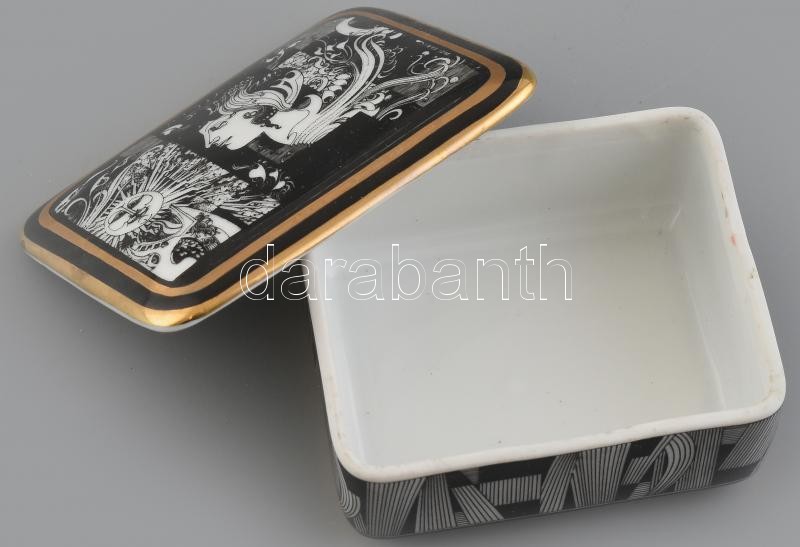 Leírás: Hollóházi Szász Endre által tervezett bonbonniere. Matricás, jelzett, kopásnyomokkal. 9x7,5 cm