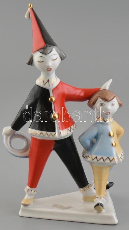 Leírás: Hollóházi porcelán harlekin bohóc kislánnyal, kézzel festett, jelzett, kis kopásnyomokkal, m: 21,5 cm