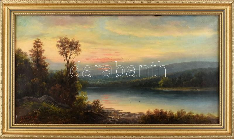 Leírás: B Lambert jelzéssel: Vízparti táj. Olaj, vászon. Dekoratív fakeretben, 37×69 cm