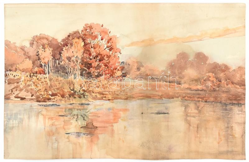 Leírás: Jelzés nélkül: Őszi vízparti táj. Akvarell, papír, kissé sérült, foltos, 33x51 cm