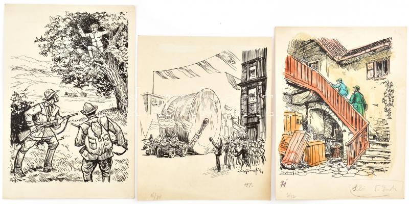 Leírás: F. Györffy Anna (1915-2006): 3 db illusztráció. Tus, vegyes technika. Jelzettek. 20x13 cm