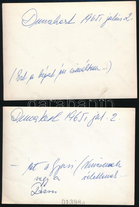 Leírás: 1965 Dunakert, 2 db hátoldalon feliratozott fotó, 8×11,5 cm