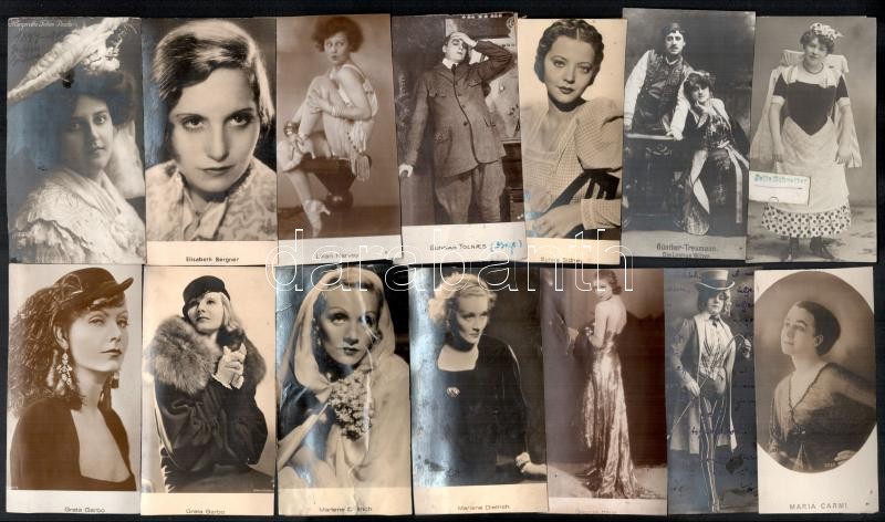 cca 1900-1940 15 db külföldi színész (Greta Garbo, Marlene Dietrich, Brigitte Helm, Lilian Harvey, Maria Carmi stb.) fotó és fotólap. Részben sérült, összes vágott, 12x7 cm körüli méretekben