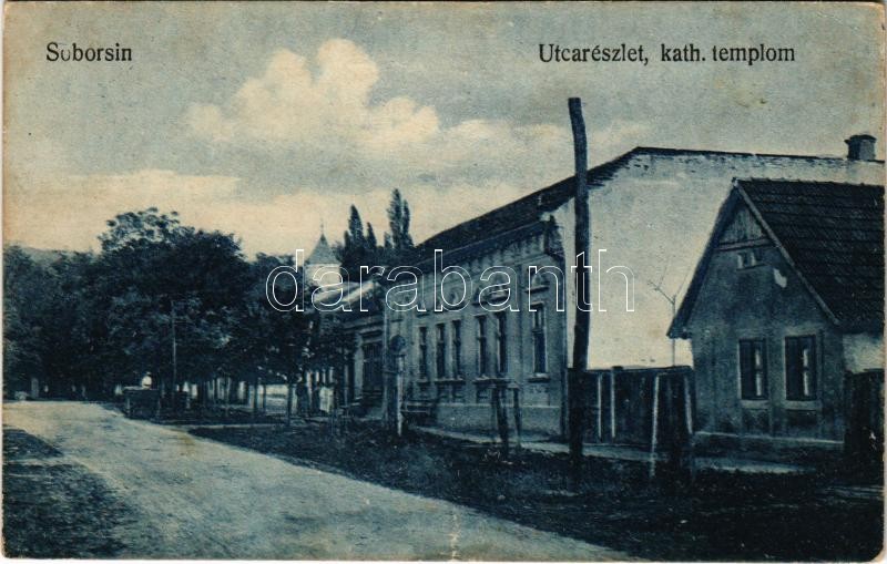 Leírás: 1921 Soborsin, Savarsin; utca részlet, Római katolikus templom / street view, Catholic church (fl)