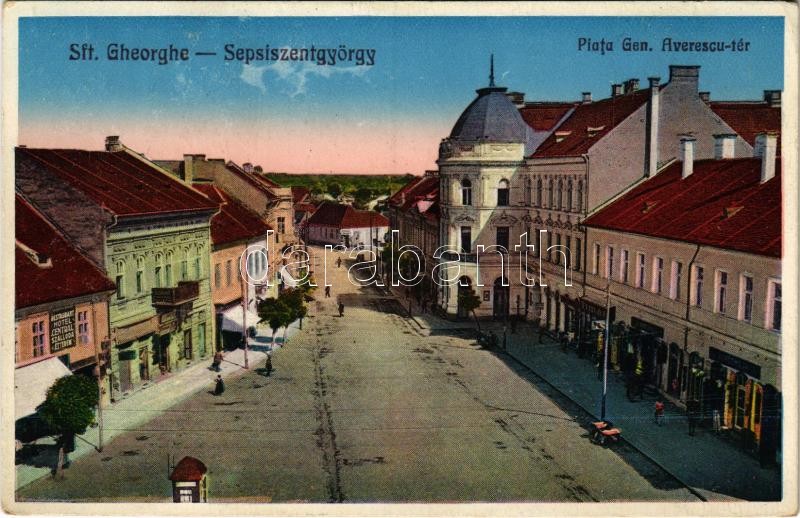 1933 Sepsiszentgyörgy, Sfantu Gheorghe; Piata Gen. Averescu / Gen. Averescu tér, Központi szálloda és étterem, üzletek, gyógyszertár. Klein és Fähndrich kiadása / square, hotel and restaurant, shops, pharmacy (EK)
