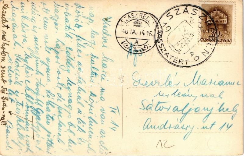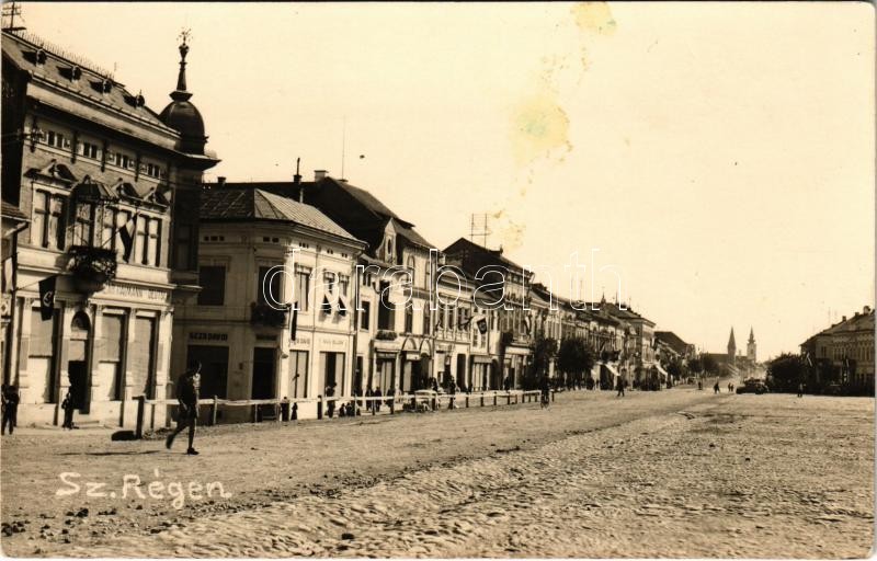 Leírás: 1940 Szászrégen, Reghin; bevonulás, Haimann és Deutsch, Geza David, Hugo Klemens üzlete, horogkeresztes zászlók / entry of the Hungarian troops, shops, swastika flags. photo + "1940 Szászrégen visszatért" So. Stpl. (fl)