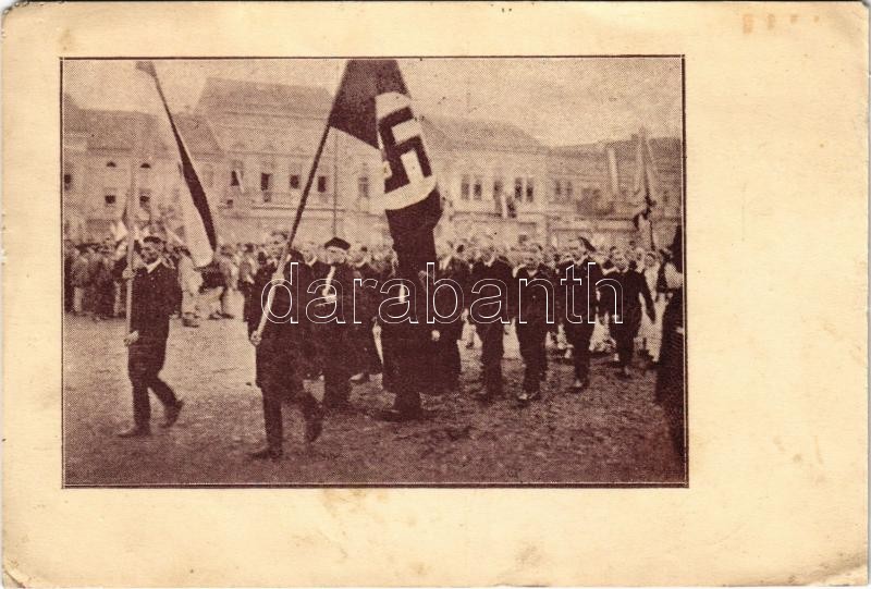 1940 Szászrégen, Reghin; bevonulás, horogkeresztes zászló / entry of t... https://www.darabanth.com/hu/414-Gyorsarveres/414.0/Kepeslapok/Erdely~1500004/1940-Szaszregen-Reghin-bevonulas-horogkeresztes-zaszlo-entry-of-the-Hungarian-troops-swas~II2586255