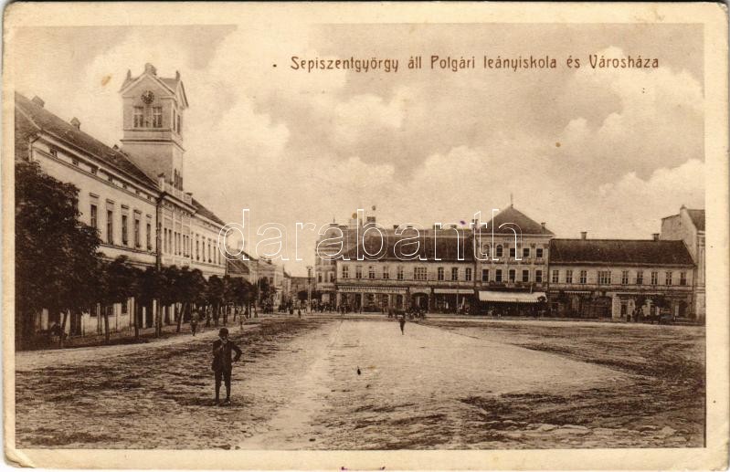 Sepsiszentgyörgy, Sfantu Gheorghe; Állami polgári leányiskola és Városháza, Bikfalvi István, Vajna Testvérek üzlete, Városi nagyszálloda. Benkő Mór kiadása / girls' school, town hall, shops, hotel (EK)