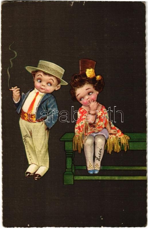 1926 Children art postcard, romantic couple. "ULTRA" 2034. (... https://www.darabanth.com/hu/414-Gyorsarveres/414.0/Kepeslapok/Gyerek~1500059/1926-Children-art-postcard-romantic-couple-ULTRA-2034-kis-szakadas-small-tear~II2588451