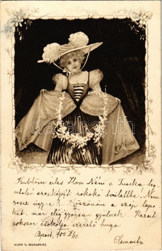 1900 Lady art postcard. Klein V. Floral litho (EK) https://www.darabanth.com/hu/414-Gyorsarveres/414.0/Kepeslapok/Holgyek~1500063/1900-Lady-art-postcard-Klein-V-Floral-litho-EK~II2587502