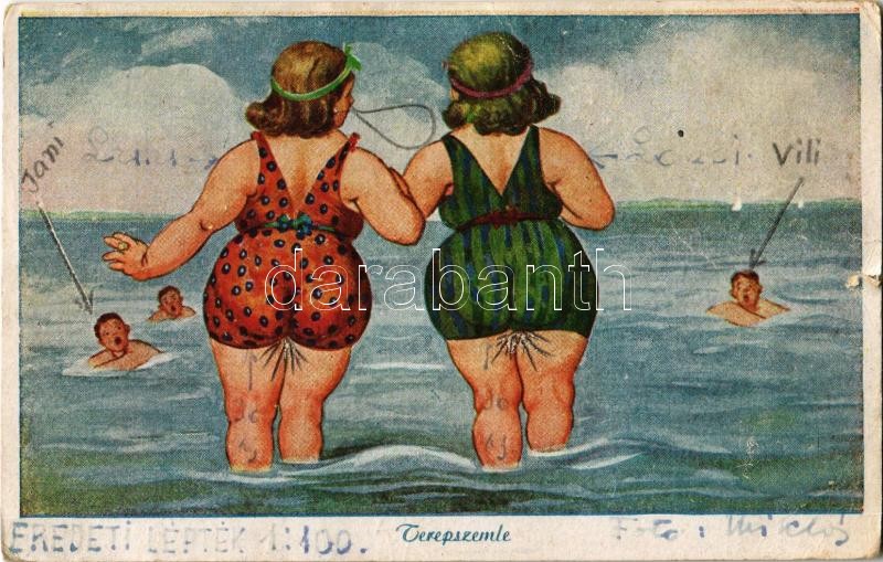 Leírás: Terepszemle / ladies at the beach, humour (szakadás / tear)