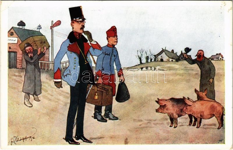 Judaica humour art postcard with K.u.K. soldiers, pigs and Jewish men.... https://www.darabanth.com/hu/414-Gyorsarveres/414.0/Kepeslapok/Judaika~1500067/Judaica-humour-art-postcard-with-KuK-soldiers-pigs-and-Jewish-men-BKWI-827-2-s-Schonpflu~II2593767