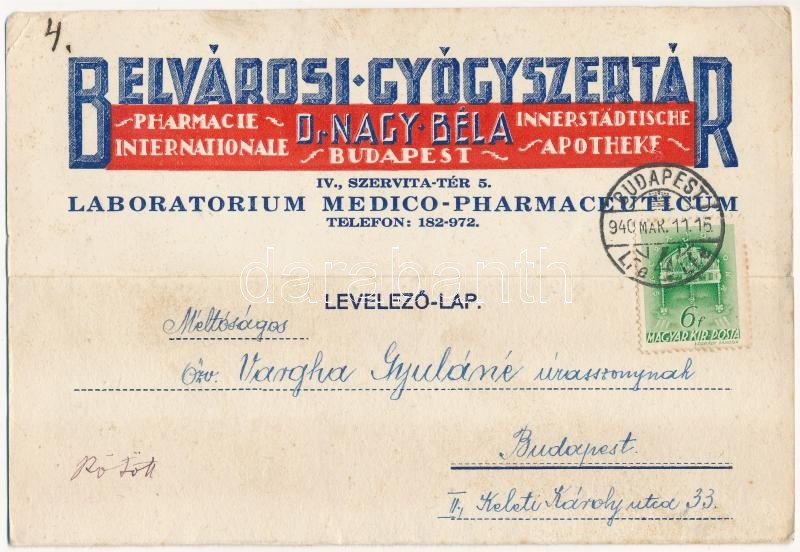 1940 Budapest, Dr. Nagy Béla Belvárosi Gyógyszertár reklámja. Szervita tér 5. / Laboratorium Medico-Pharmaceuticum / Hungarian paharmacy advertisement (EK)