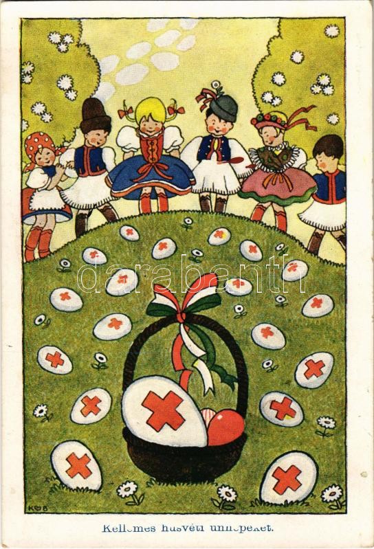 Kellemes Húsvéti ünnepeket! Magyar Ifjúsági Vöröskereszt Egyesület kiadása / Red Cross propaganda art postcard with Easter greeting, Hungarian folklore