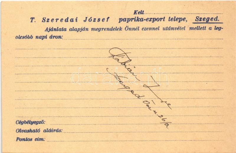Leírás: Szeredai József szegedi henteskellék nagykereskedés reklámlapja, paprika export telep / Hungarian pepper export and butcher supplies advertising card s: Fábián