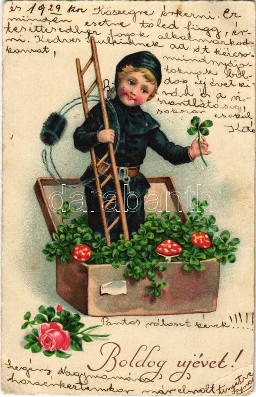 1934 Boldog Újévet! / New Year greeting art postcard, chimney sweeper ... https://www.darabanth.com/hu/414-Gyorsarveres/414.0/Kepeslapok/Udvozlolapok-Unnepek~1500085/1934-Boldog-Ujevet-New-Year-greeting-art-postcard-chimney-sweeper-with-ladder-mushroom-and-cl~II2292556